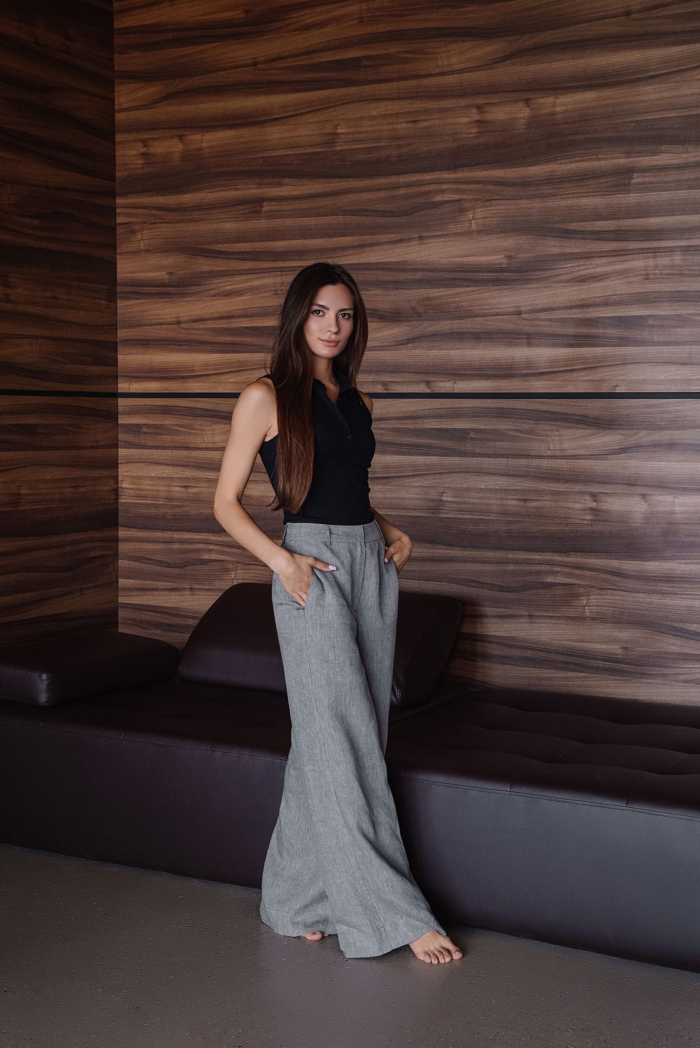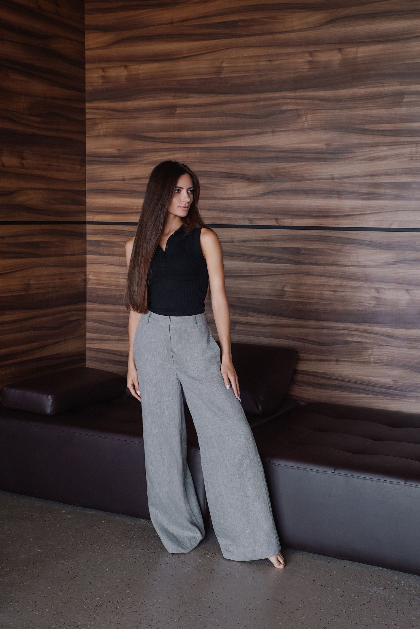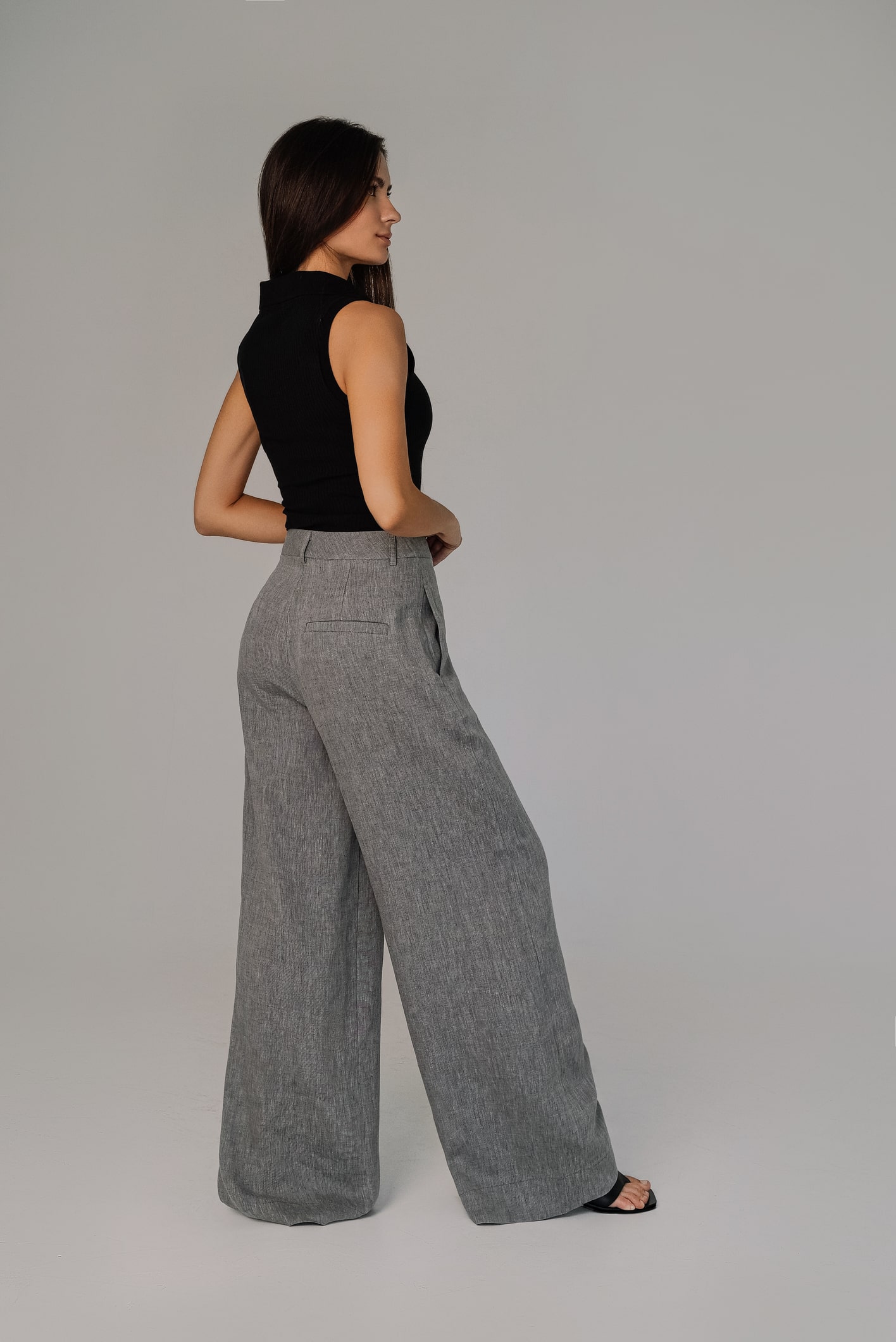 Летние брюки из итальянского льна. Брюки с высокой  посадкой, прилегающие к бедрам и расширяющиеся к низу. Застежка на молнию, брючный крючок и внутреннюю пуговицу. Два кармана в боковых швах, один декоративный карман сзади.