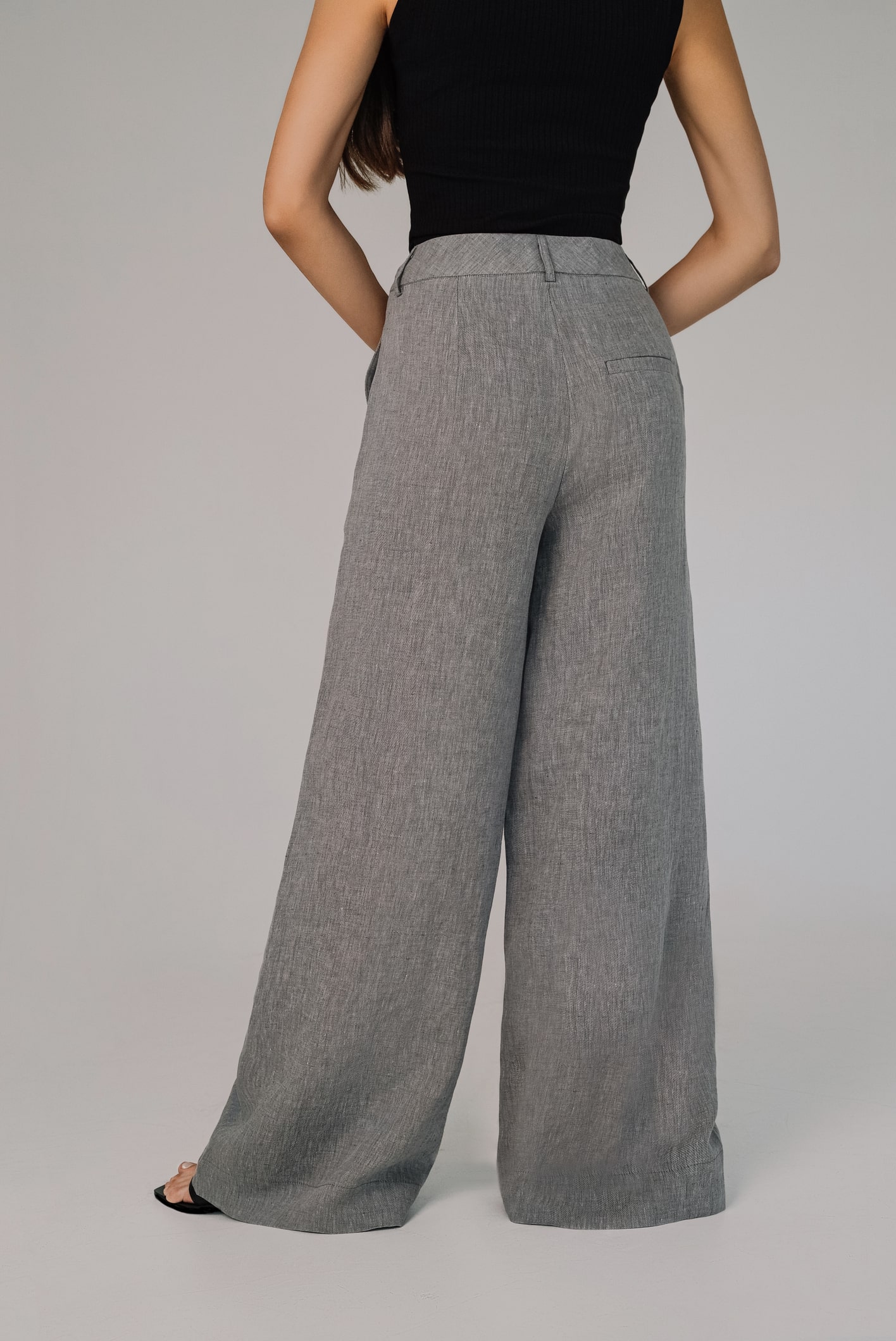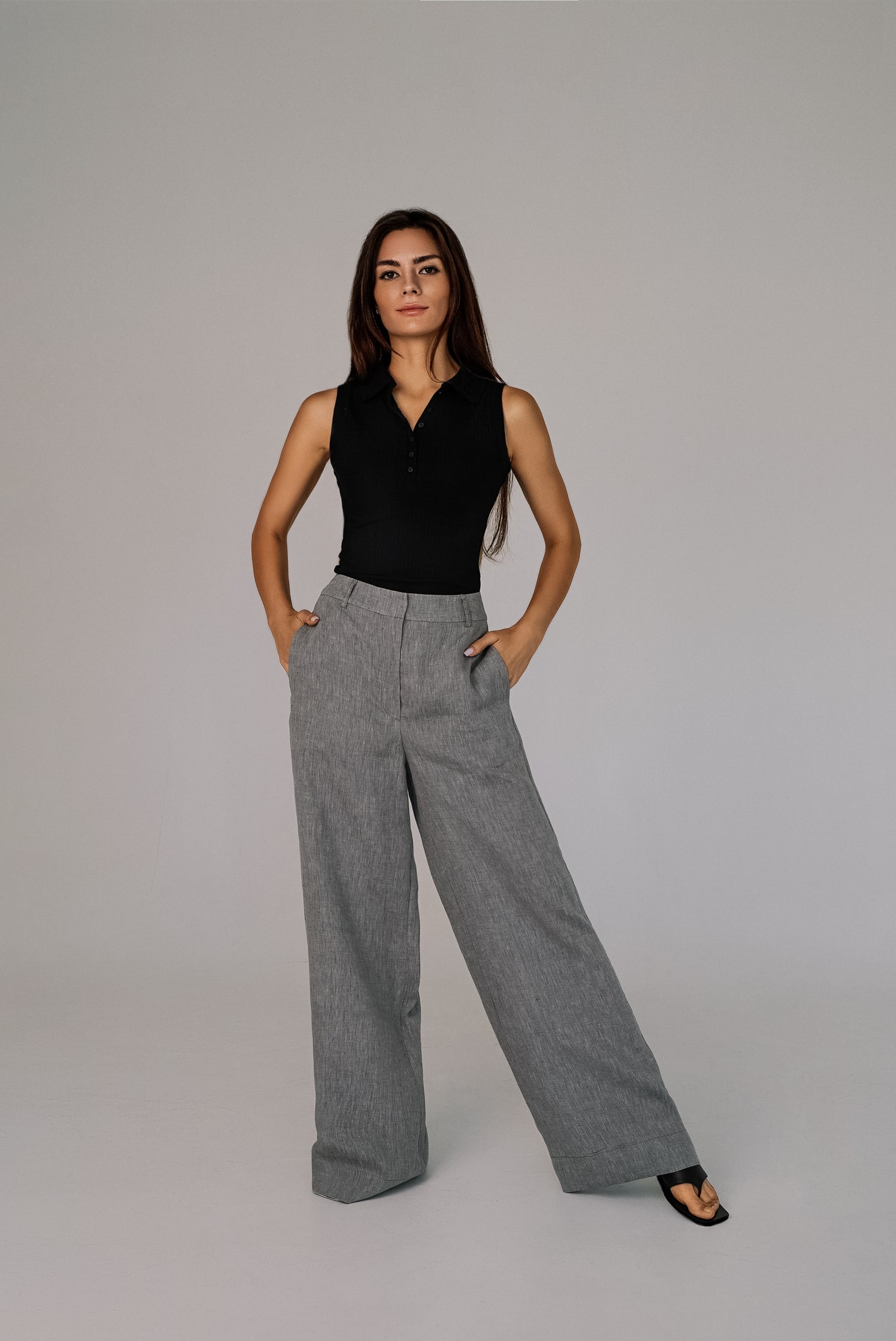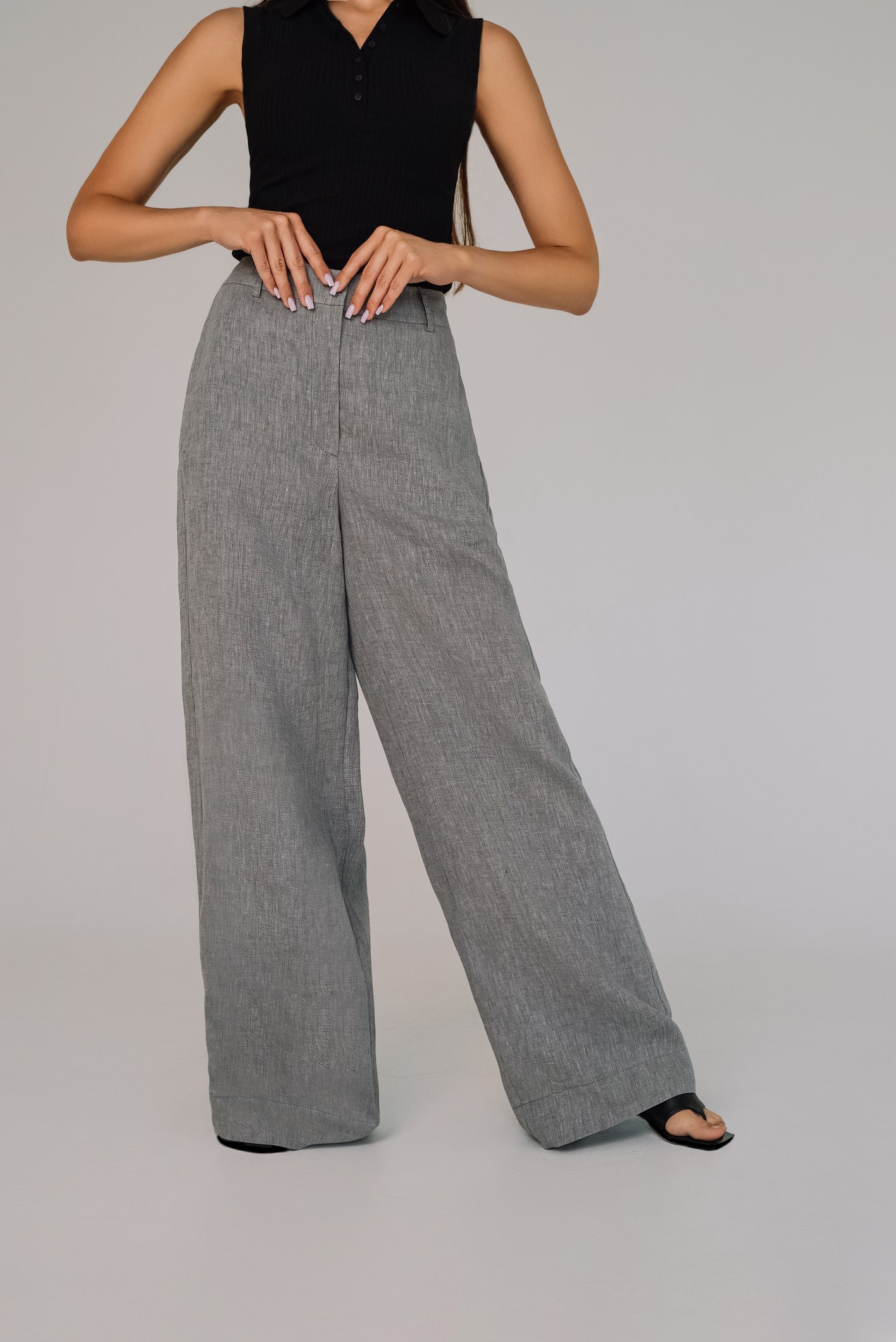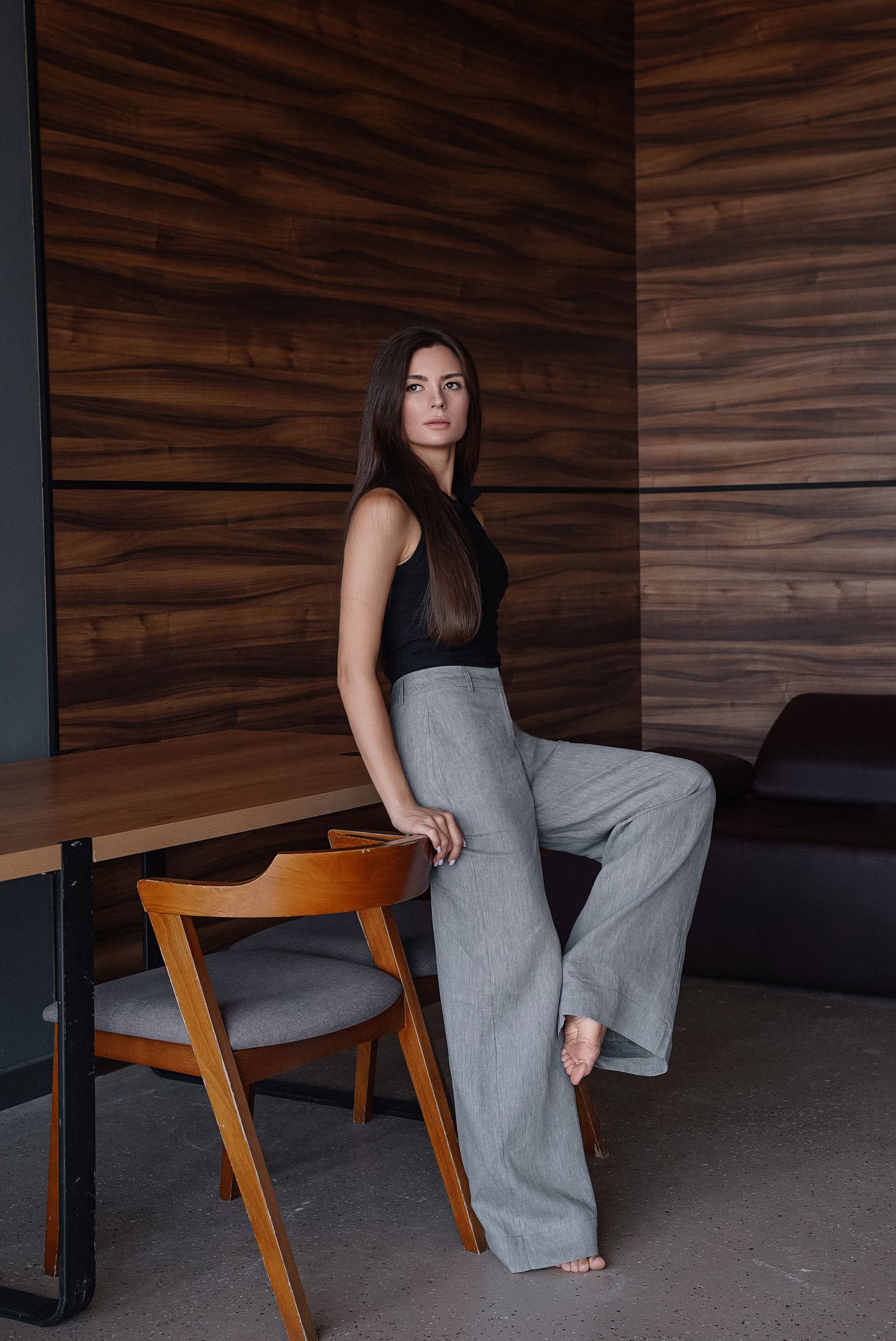 Летние брюки из итальянского льна. Брюки с высокой  посадкой, прилегающие к бедрам и расширяющиеся к низу. Застежка на молнию, брючный крючок и внутреннюю пуговицу. Два кармана в боковых швах, один декоративный карман сзади.